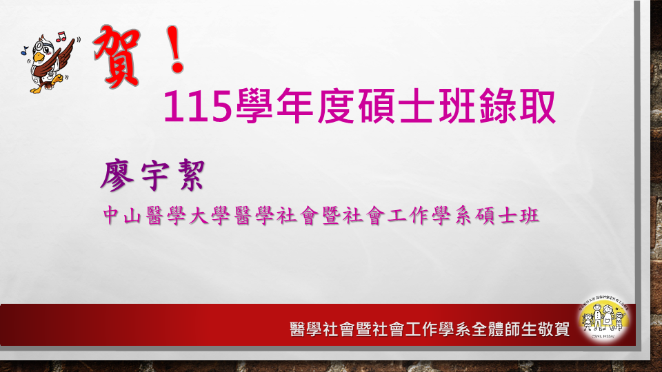 《碩士班甄試錄取榜單》賀!廖宇絜考取中山醫學大學醫學社會暨社會工作學系碩士班